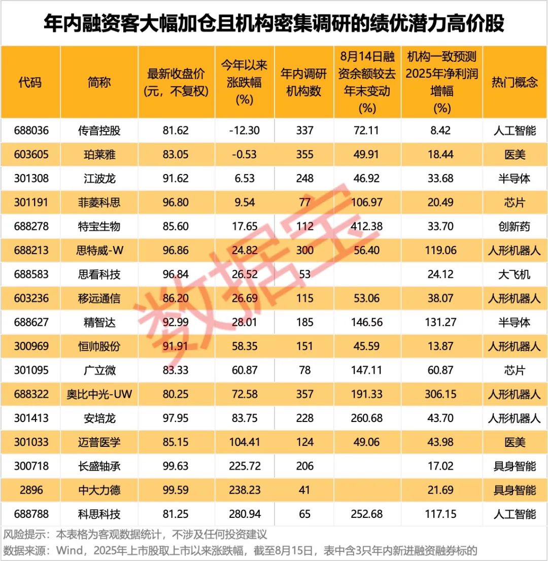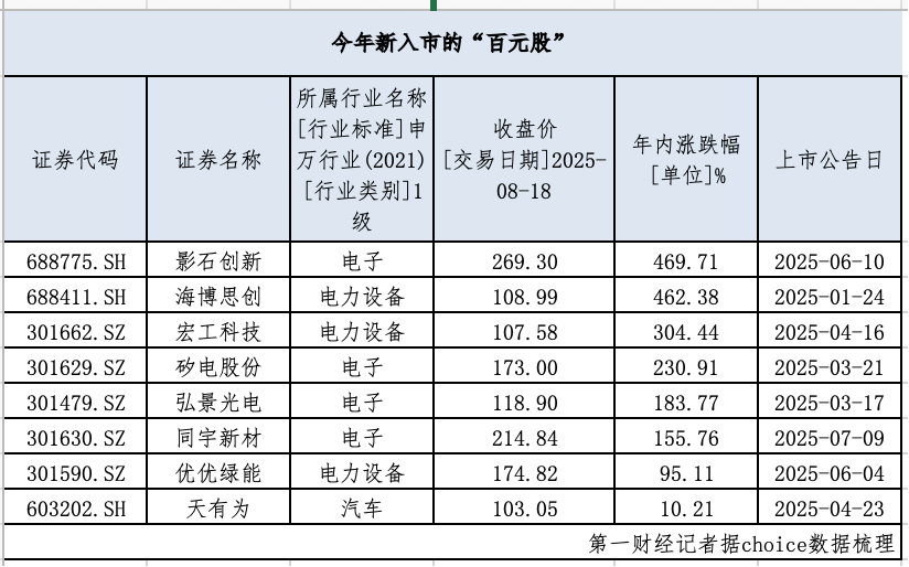 71只新晋百元股中,8只是年内新上市的股票,多集中在电子、电力设备行业。例如影石创新(688755.SH)今年6月上市,8月18日报收269元/股K8金融,年内涨幅达到469.7%。今年1月上市的海博思创(688411.SH)年内涨幅也达到462%。宏工科技(301662.SZ)、矽电股份(301629.SZ)也都在今年上市,年内涨幅分别为304.44%、230.91%。