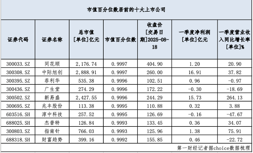 其中,同花顺、中际旭创(300308.SZ)、菲利华(300395.SZ)、广生堂、新易盛(300502.SZ)等45只个股,总市值位于历史99%分位以上,已逼近或达到历史最高值。