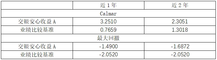 从风险收益角度来看,交银安心收益A表现较为优秀。其Calmar比率及最大回撤数据皆显著优于业绩比较基准,具备较强的投资性价比。基金经理魏玉敏历经多轮周期,对风险控制有着较深体悟,通过精选优质且适配组合定位的资产、集中度控制、流动性监控等多维手段,始终将“回撤控制”放在组合管理的核心位置。有效的下行风险控制,有望避免短期大幅回撤对长期收益的侵蚀;相对平滑的净值曲线亦能实质性缓解投资者的焦虑。