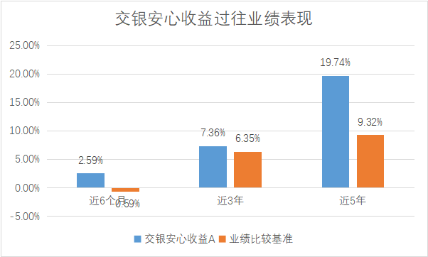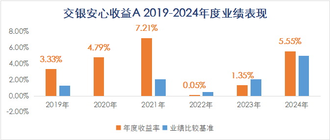 交银安心收益债券A(C)历年业绩/现行业绩比较基准(中债综合全价指数)2020年A类4.79%(C、D、E类未成立)/-0.07%,2021年A类7.21%(C、D、E类未成立)/2.10%,2022年A类0.05%(C、D、E类未成立)/0.51%,2023年A类1.35%,E类0.66%(C、D类未成立)/2.06%,2024年A类5.55%,E类5.93%(C、D类未成立%)/4.98%,2025年上半年A类1.67%,E类1.50%,D类1.08%(C类未成立%)/-0.14%。本基金A自2022/01/27至2025/06/30由魏玉敏单独管理,任职回报为8.64%。本基金D自2025/3/28至2025/6/30由魏玉敏单独管理,任职回报为1.08% 。本基金E自2023/8/25至2025/6/30由魏玉敏单独管理,任职回报为8.22%。本基金在上述业绩登载期间曾发生过投资目标、投资范围、投资策略或基金经理变动,具体请见基金法律文件及基金定期报告。